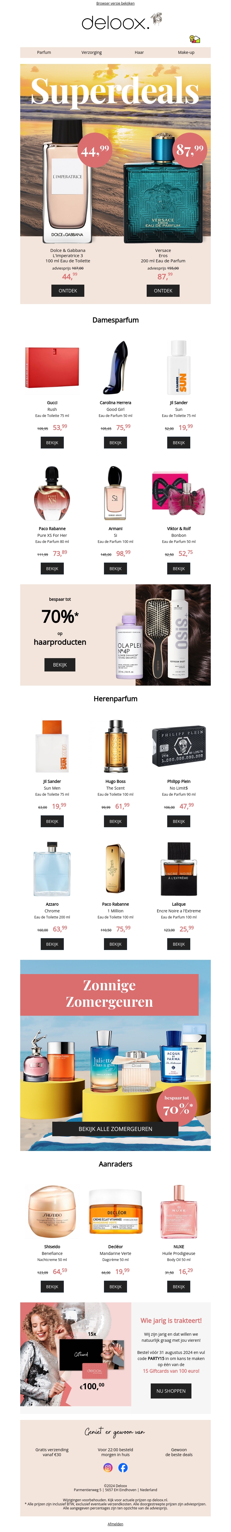 Bekijk de beste deals van 15 augustus 2024. Ontdek kortingen op luxe dames- en herenparfums. Bespaar tot 70% op haarproducten. Geniet van zomerse geuren en aanbevolen producten. Mis de exclusieve kortingscode niet!