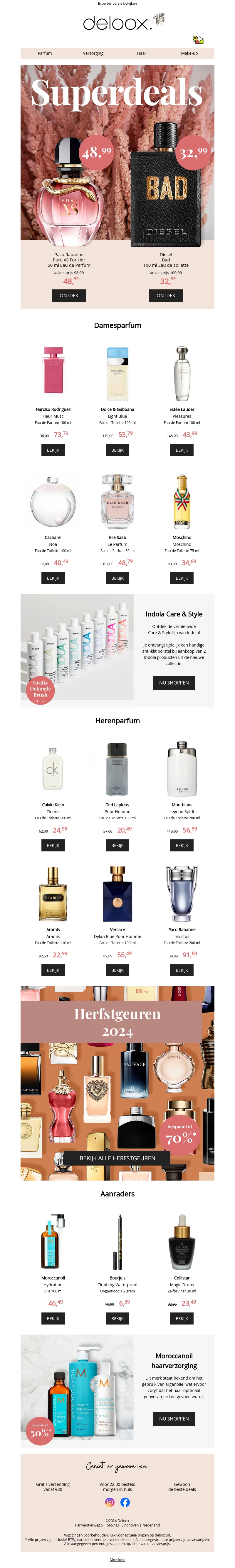 Dit is de perfecte gelegenheid om te profiteren van exclusieve kortingen op populaire parfums en verzorgingsproducten. Van damesgeuren tot herengeuren, er is voor ieder wat wils. Mis ook de aanbiedingen op haarverzorging niet. Ontdek alles in onze nieuwsbrief van 19-09-2024.