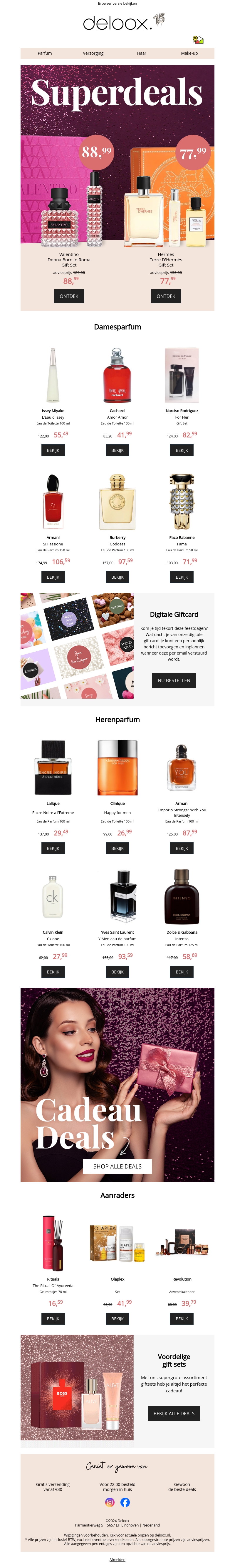 Beleef de beste aanbiedingen bij Deloox met onze superdeals op dames- en herenparfums. Of u nu op zoek bent naar een nieuw parfum voor uzelf of een perfect cadeau voor iemand anders, wij hebben geweldige kortingen. Ontdek populaire merken zoals Armani, Hugo Boss en Calvin Klein. Bekijk ook onze speciale cadeau deals voor de feestdagen.
