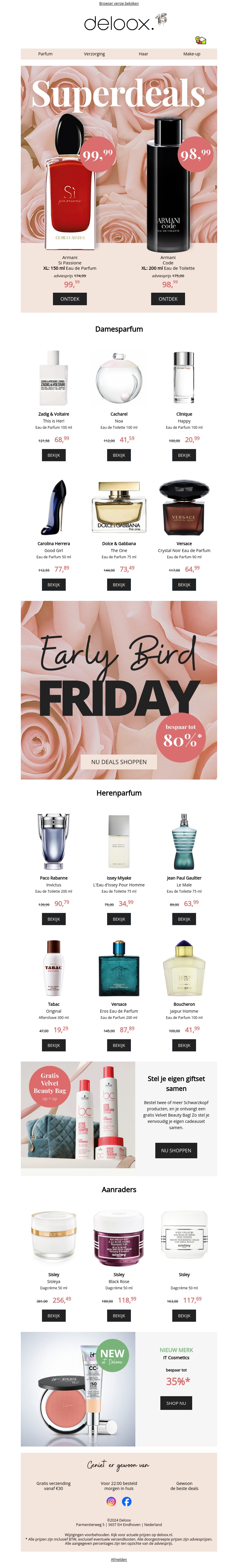 Profiteer van onze superdeals op dames- en herenparfum met kortingen tot wel 80%! Shop vroeg met onze Early Bird Friday aanbiedingen en stel je eigen giftset samen. Mis deze kans niet en bezoek nu onze online winkel voor de beste deals.