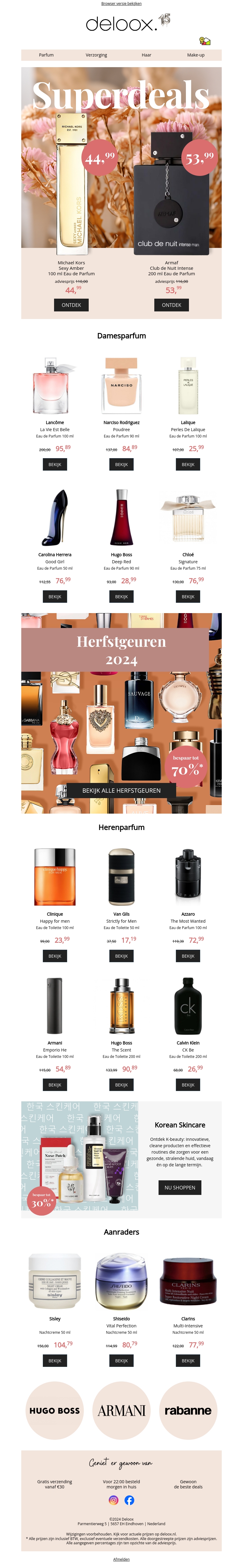 Profiteer van geweldige kortingen op dames- en herenparfums deze herfst. Denk aan merken als Hugo Boss, Armani en Rabanne met kortingen tot wel 70%. Ontdek ook de nieuwste huidverzorgingsproducten, inclusief luxe merken zoals Sisley en Shiseido.
