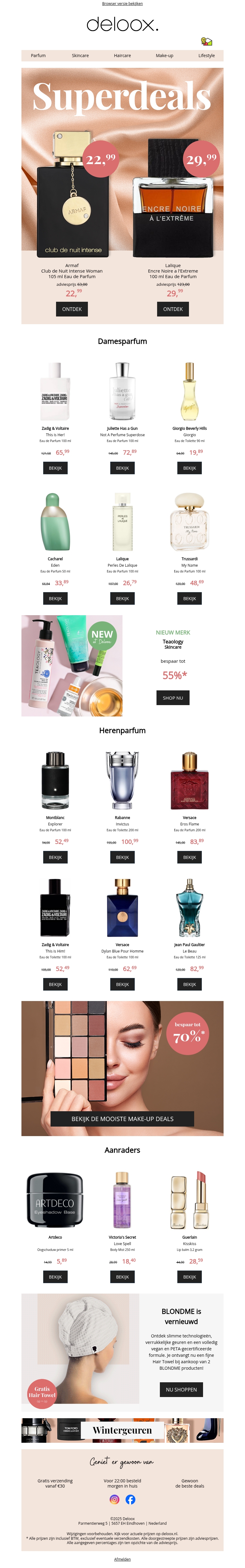 Deze nieuwsbrief brengt je de allerbeste deals op dames- en herenparfum. Ontdek populaire merken zoals Armaf en Lalique voor verrassend lage prijzen. Profiteer van kortingen tot wel 70% op geselecteerde make-up producten. Mis het niet en bekijk de aanbevolen items voor fantastische besparingen.