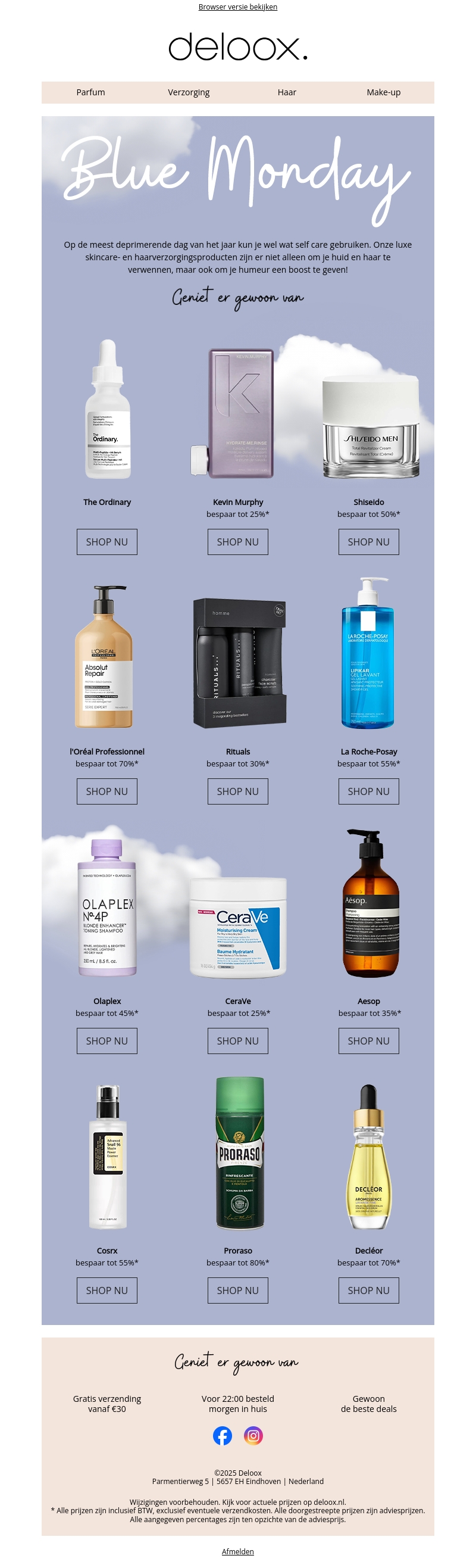 Verander je sombere Blue Monday in een stralende dag met onze exclusieve deals. Geniet van aantrekkelijke kortingen op topmerken voor huid- en haarverzorging. Verwen jezelf met producten van The Ordinary, Shiseido, en meer. Bestel voor 22:00 uur en ontvang alles de volgende dag. Gratis verzending vanaf โฌ30.