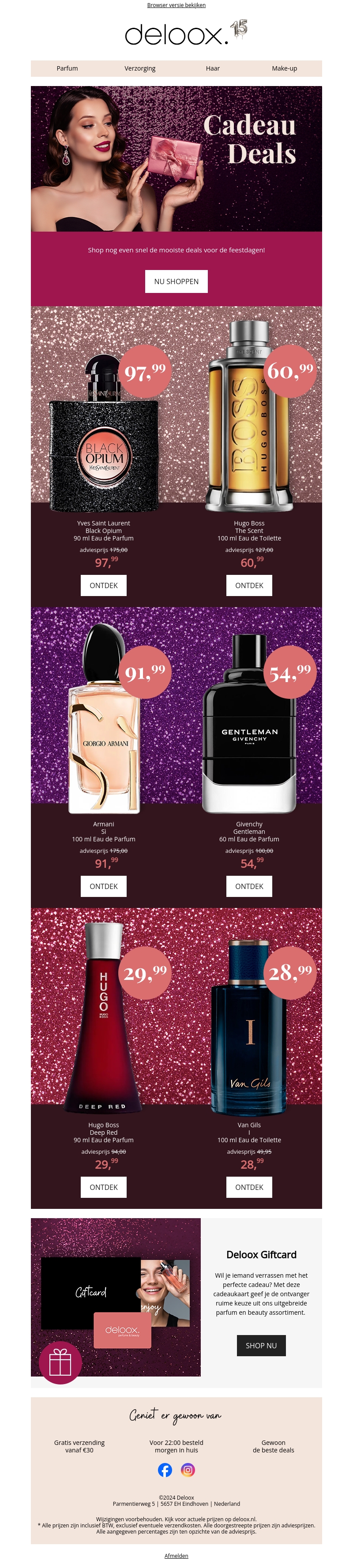 Beleef de magie van cadeaushoppen met ongelooflijke kortingen tot 60% op luxe parfums van topmerken zoals Yves Saint Laurent, Hugo Boss, Armani en Givenchy. Onze kerstdeals zijn perfect als geschenk voor onder de kerstboom. Bekijk ook de veelzijdige Deloox cadeaubon voor een persoonlijke touch. Shop nu en geniet van gratis verzending bij bestellingen boven โฌ30.
