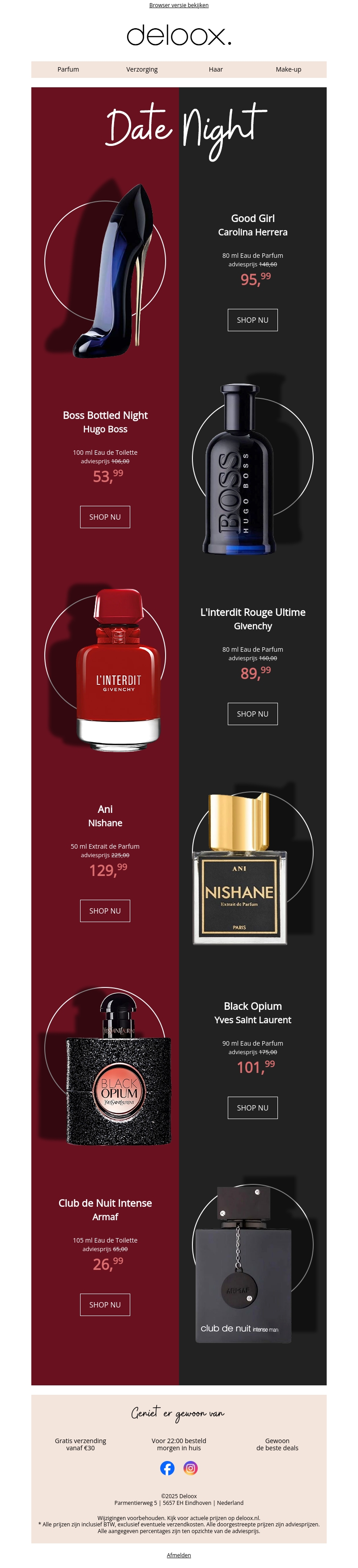Maak je klaar voor een onvergetelijke date night met deze exclusieve parfums. Profiteer van kortingen tot 55% op merken zoals Carolina Herrera en Yves Saint Laurent. Bestel voor 22:00 en ontvang je bestelling morgen al thuis!