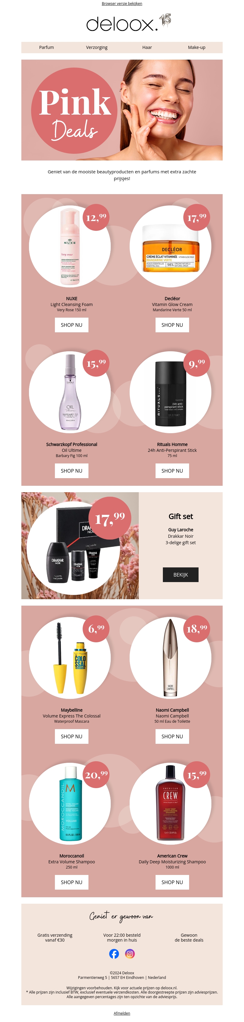Ontdek de beste aanbiedingen voor beautyproducten en parfums met Pink Deals bij Deloox. Geniet van kortingen op producten van topmerken zoals NUXE, DeclΓ©or, Rituals en meer. Mis deze kans niet om hoogwaardige producten voor een zachte prijs te krijgen. Ga nu shoppen en verwen jezelf met de beste deals!