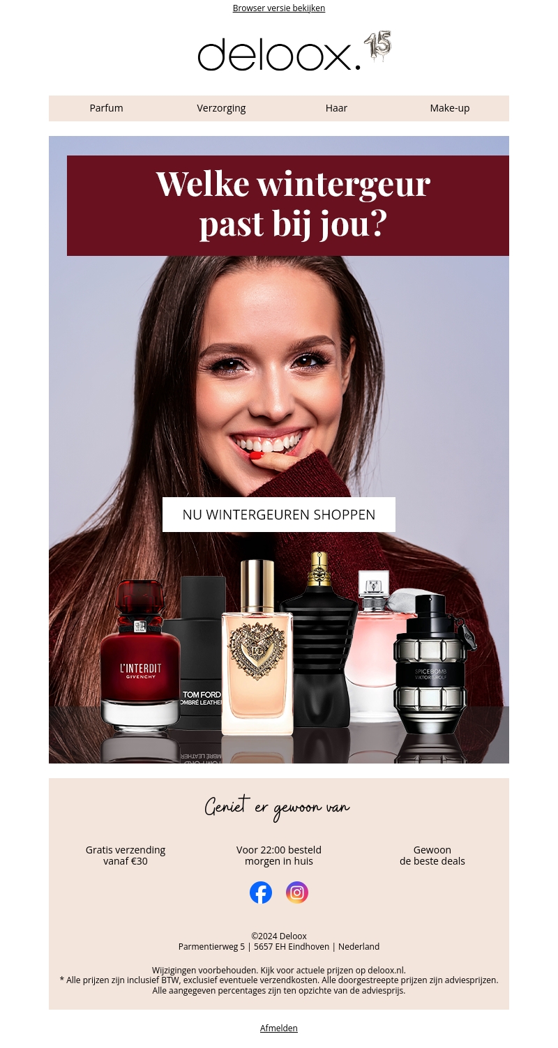 Dompel jezelf onder in de heerlijke aroma's van het nieuwe winterseizoen bij Deloox. Ontdek welke geur het beste bij jou past met onze exclusieve collectie parfum. Profiteer van gratis verzending bij bestellingen vanaf €30 en ontvang je bestelling de volgende dag als je voor 22:00 uur bestelt. Verwen jezelf met de beste deals en de nieuwste geuren speciaal voor de winter!