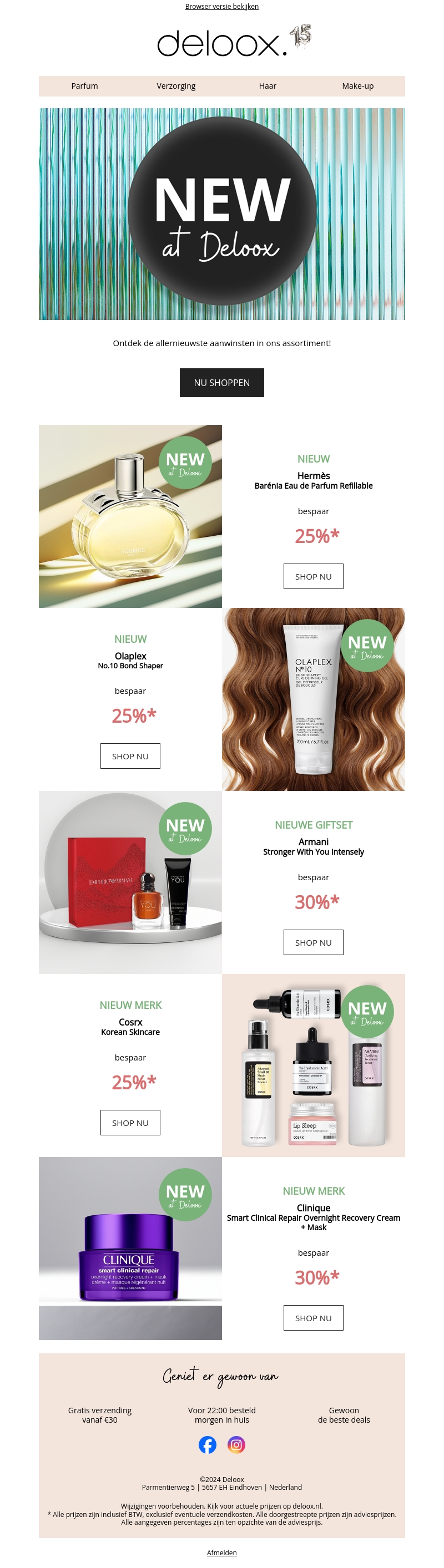 Verken de nieuwste toevoegingen aan het assortiment van Deloox. Bespaar tot 30% op merken zoals Hermès, Olaplex, Armarni, Cosrx en Clinique. Geniet van gratis verzending en snelle levering bij bestellingen vanaf €30. Mis deze kans niet voor de beste deals op topmerken!