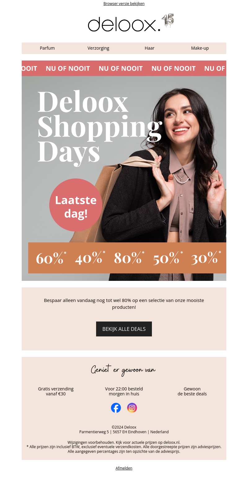 De Deloox Shopping Days zijn bijna voorbij! Grijp je kans om tot wel 80% te besparen op een geweldige selectie producten. Alleen vandaag nog gratis verzending vanaf โฌ30 en morgen in huis als je voor 22:00 bestelt. Bekijk snel alle deals!