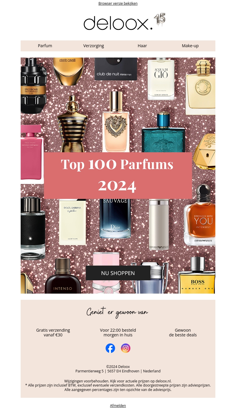 Laat je verrassen door de top 100 parfums van 2024! Of je nu van frisse, bloemige of houtachtige geuren houdt, er is voor ieder wat wils. Profiteer van gratis verzending bij bestellingen vanaf โฌ30. Bestel voor 22:00 uur en ontvang je favoriete geur morgen al in huis!
