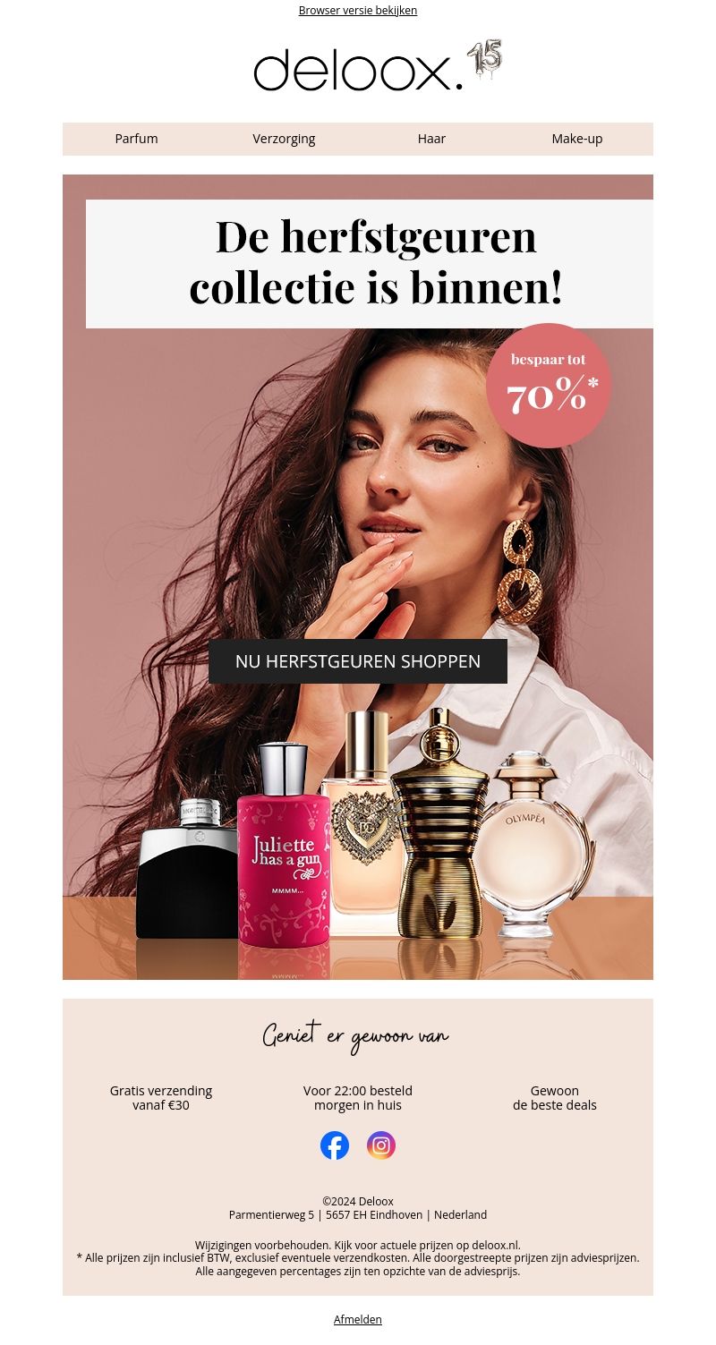 De herfstgeuren collectie is binnen bij Deloox! Ontdek nu de nieuwste geuren en profiteer van kortingen tot wel 70%. Gratis verzending vanaf โฌ30. Bestel voor 22:00 uur en ontvang je bestelling morgen in huis.