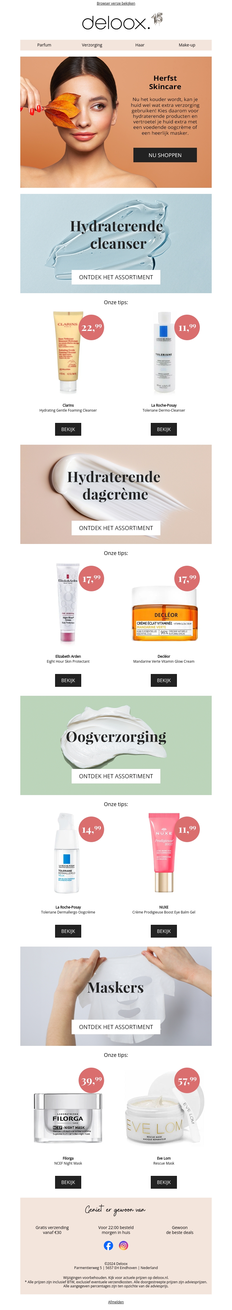 Nu de herfst arriveert, is het de perfecte tijd voor selfcare. Deze nieuwsbrief presenteert een scala aan hydraterende cleansers, dagcrèmes, oogverzorging en maskers om je huid te verwennen. Profiteer van speciale aanbiedingen en verwen jezelf met topmerken zoals Clarins, La Roche-Posay en Decleor. Ontdek het complete assortiment en geniet van de beste deals. Ga voorbereid de koude dagen in met de ultieme skincare routine.