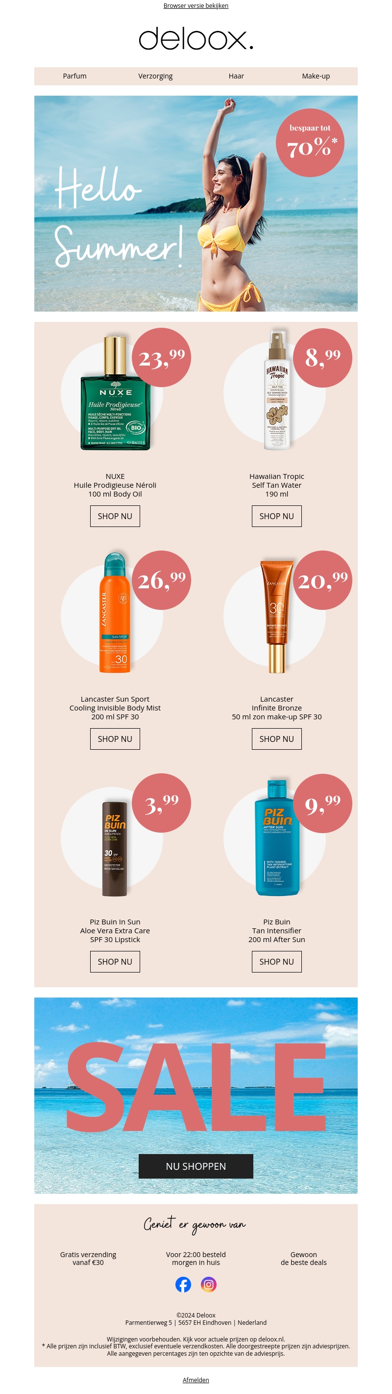 Maak je zomer compleet met onze speciale selectie zomerproducten. Van zonnebrand tot after-sun, wij hebben alles wat je nodig hebt om te genieten van de zon! Profiteer nu van kortingen tot 70% op topmerken zoals NUXE, Hawaiian Tropic, Lancaster en Piz Buin. Mis deze kans niet om jouw favoriete zomerproducten in te slaan!