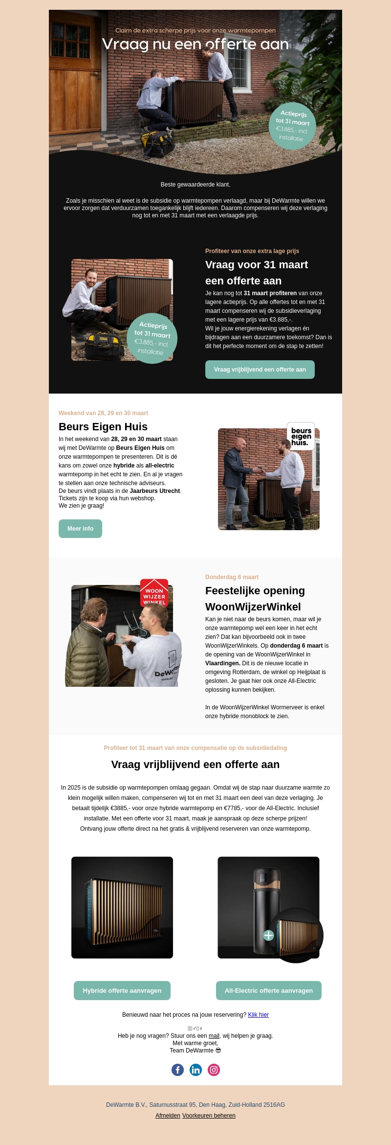 Mis je kans niet om tot 31 maart te profiteren van onze actieprijs op warmtepompen. Bezoek ons tijdens de Beurs Eigen Huis of de feestelijke opening van de WoonWijzerWinkel. Vraag nu vrijblijvend een offerte aan en verlaag je energiekosten voor een duurzame toekomst. Bekijk ook onze hybride en all-electric opties in de WoonWijzerWinkel Wormerveer.