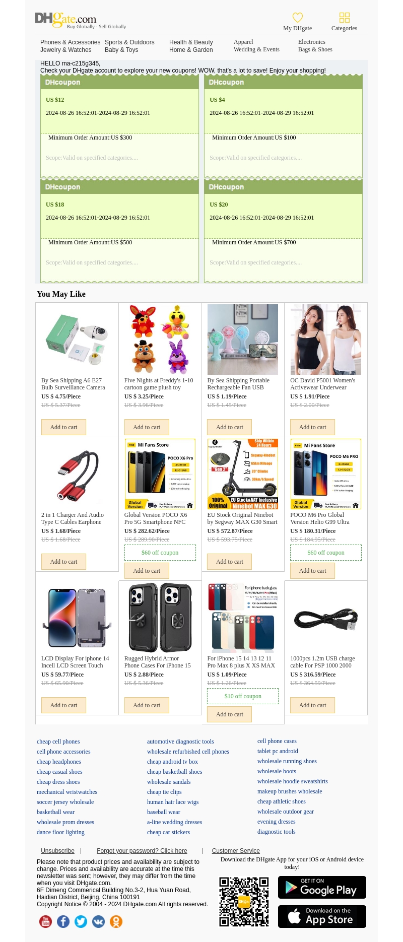 Profiteer nu van fantastische kortingen met onze nieuwste DHcoupon! Bespaar $4 tot $20 op je aankopen bij DHgate.com. Bekijk de speciale aanbiedingen voor producten zoals elektronica, speelgoed en mode. Geldig van 26 augustus 2024 tot 29 augustus 2024.