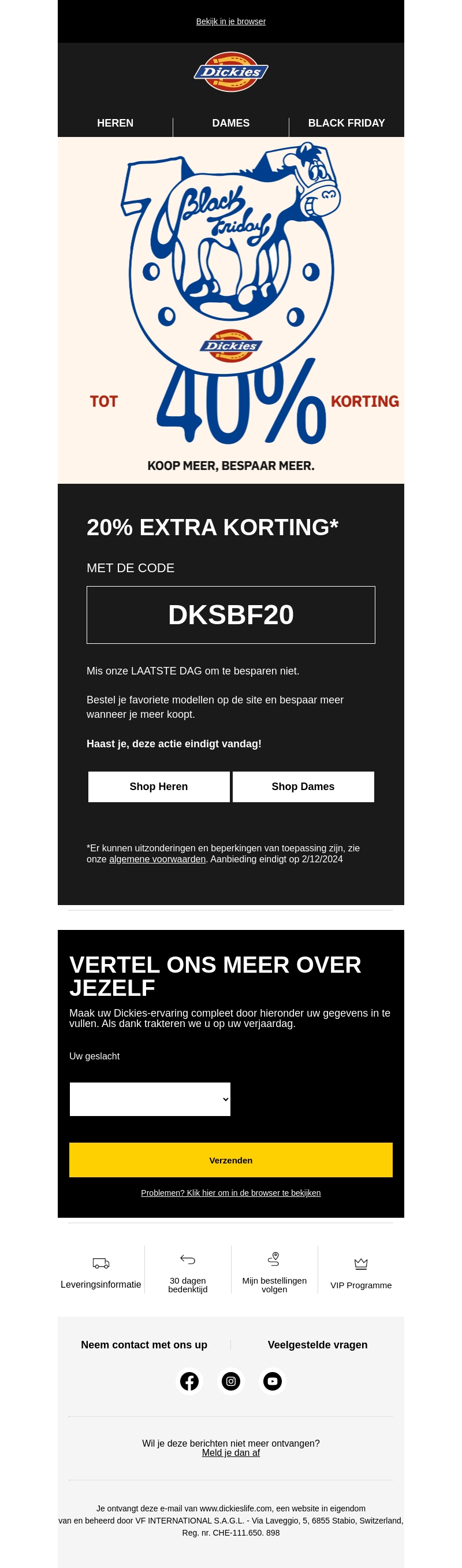 Grijp je kans met de Black Friday aanbiedingen van Dickies. Ontvang tot 40% korting op diverse items. Gebruik de kortingscode DKSBF20 voor extra 20% korting. Haast je, want de actie eindigt vandaag! Profiteer van geweldige deals voor zowel heren als dames.