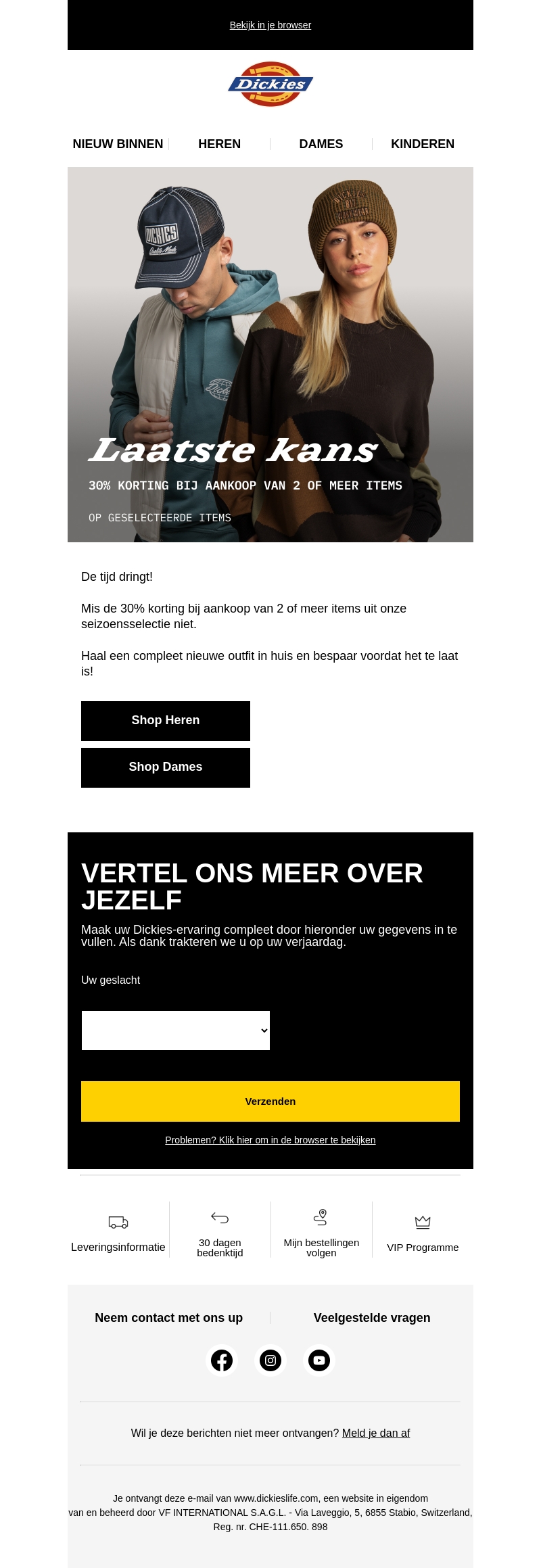 De tijd dringt! Dickies biedt je de mogelijkheid om 30% te besparen bij aankoop van 2 of meer items uit hun seizoensselectie. Zorg ervoor dat je deze kans niet mist en vul je garderobe aan met stijlvolle en voordelige items.