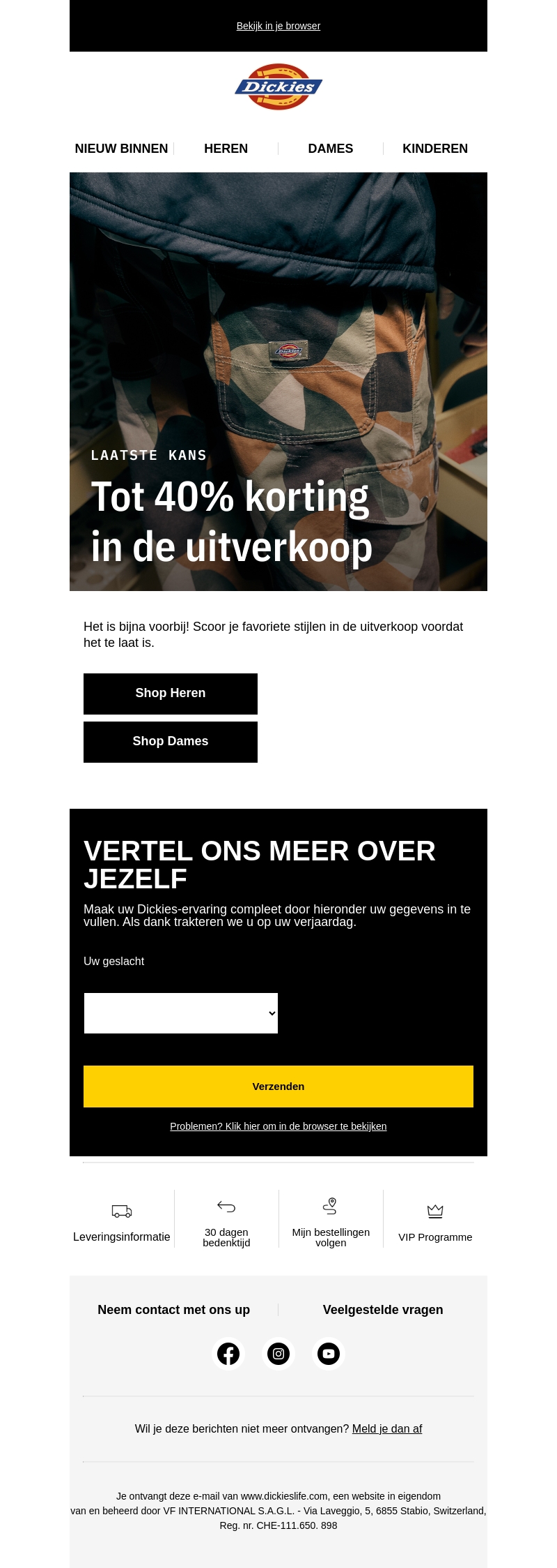 Mis het niet! De uitverkoop bij Dickies eindigt morgen en biedt kortingen tot 40% op je favoriete stijlen. Bezoek onze heren- en damescollectie en profiteer van de laatste kans om te besparen. Zorg dat je op tijd bent en sla je slag vóór het te laat is.