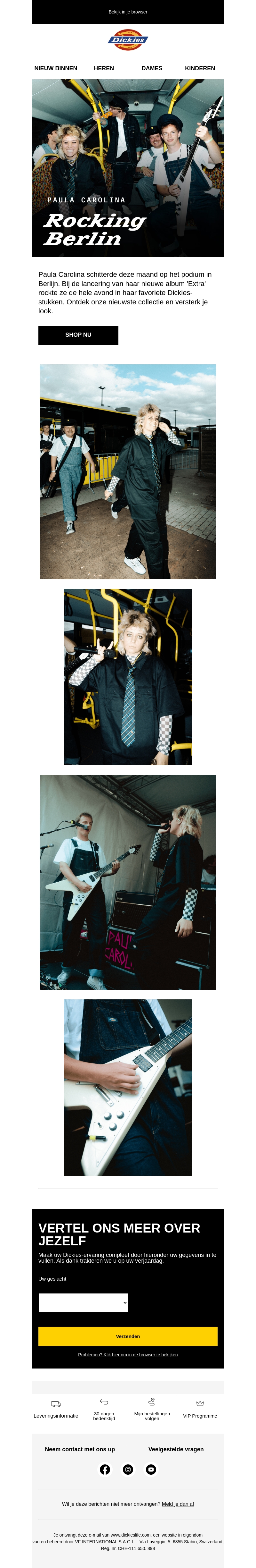 Paula Carolina schitterde deze maand op het podium in Berlijn. Bij de lancering van haar nieuwe album 'Extra' droeg ze haar favoriete Dickies-stukken. Ontdek nu de nieuwste collectie en versterk je look met deze unieke stijlen. Shop de collectie en rock zelf in stijl. Nieuwe items voor zowel heren als dames beschikbaar. Mis deze kans niet om je garderobe een upgrade te geven.