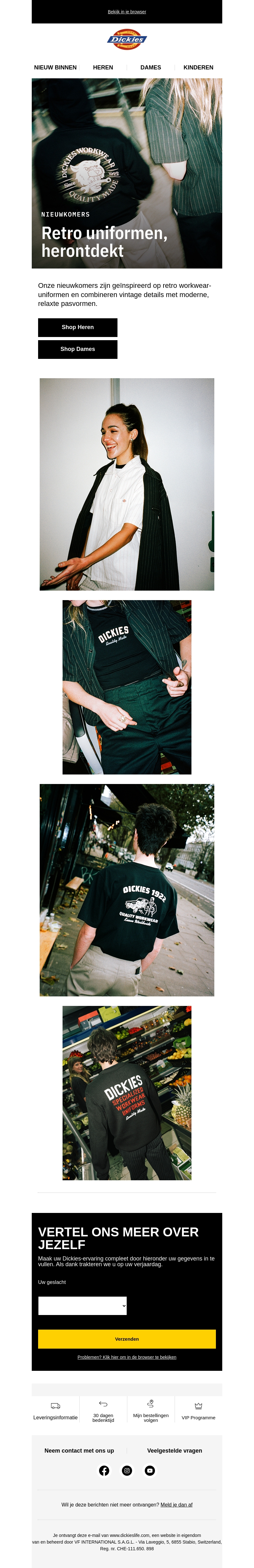 Onze nieuwste collectie is geïnspireerd op retro werkkleding. We combineren vintage details met moderne, comfortabele pasvormen. Blader nu door onze selectie voor heren en dames en ontdek de perfecte retro-stijl. Beleef de unieke uitstraling van Dickies met onze nieuwste outfits. Geschikt voor elke gelegenheid.