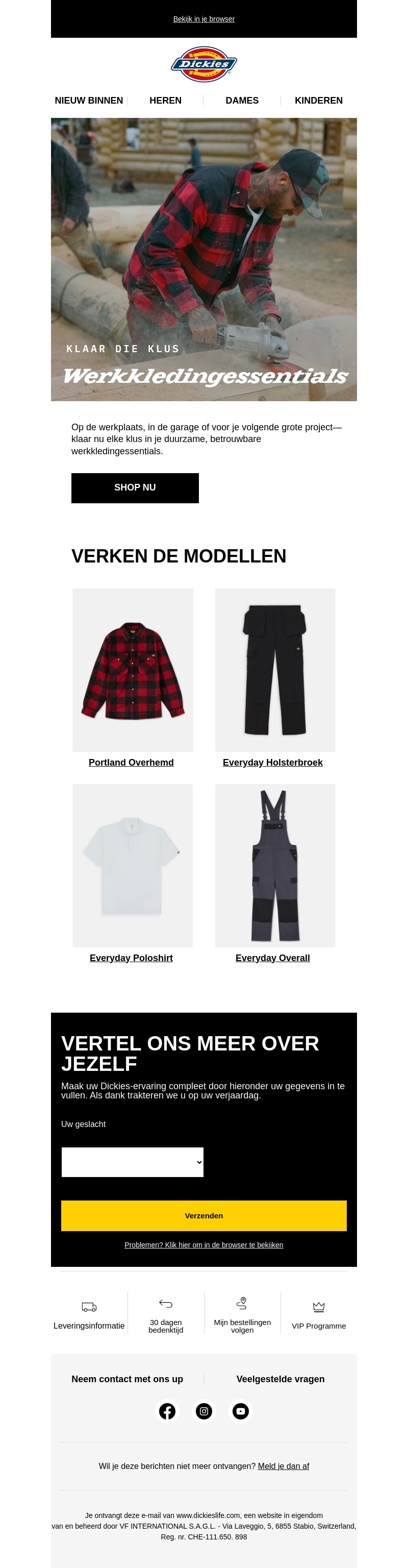 Op de werkplaats, in de garage of voor je volgende grote projectโklaar nu elke klus in je duurzame, betrouwbare werkkledingessentials. Shop nu de nieuwste modellen van Dickies, zoals het Portland Overhemd en de Everyday Holsterbroek.
