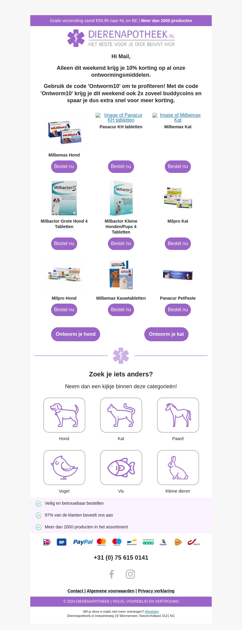 Dit weekend ontvang je 10% korting op alle ontwormingsmiddelen bij Dierenapotheek.nl. Gebruik de code 'Ontworm10' voor meer voordeel. Je ontvangt bovendien 2x zoveel buddycoins bij gebruik van deze code. Mis deze kans niet om zowel je hond als kat te beschermen tegen wormen. Veilig en betrouwbaar bestellen met meer dan 2000 producten beschikbaar.
