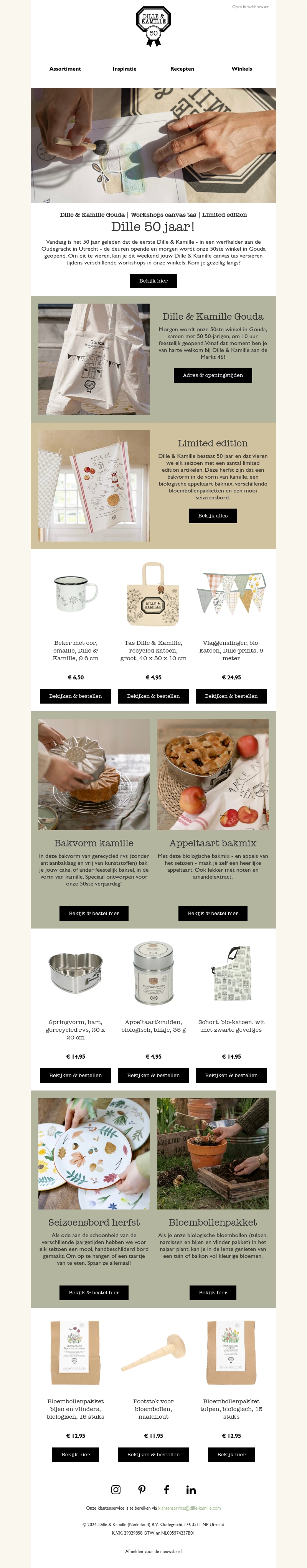 Dille & Kamille bestaat 50 jaar en viert dit met speciale workshops en een limited edition collectie. Ontdek de unieke producten en kom gezellig langs in de winkel in Gouda. Haal bijzondere items in huis zoals biologische appeltaartmix, herfstseizoensbord en biologische bloembollenpakket.