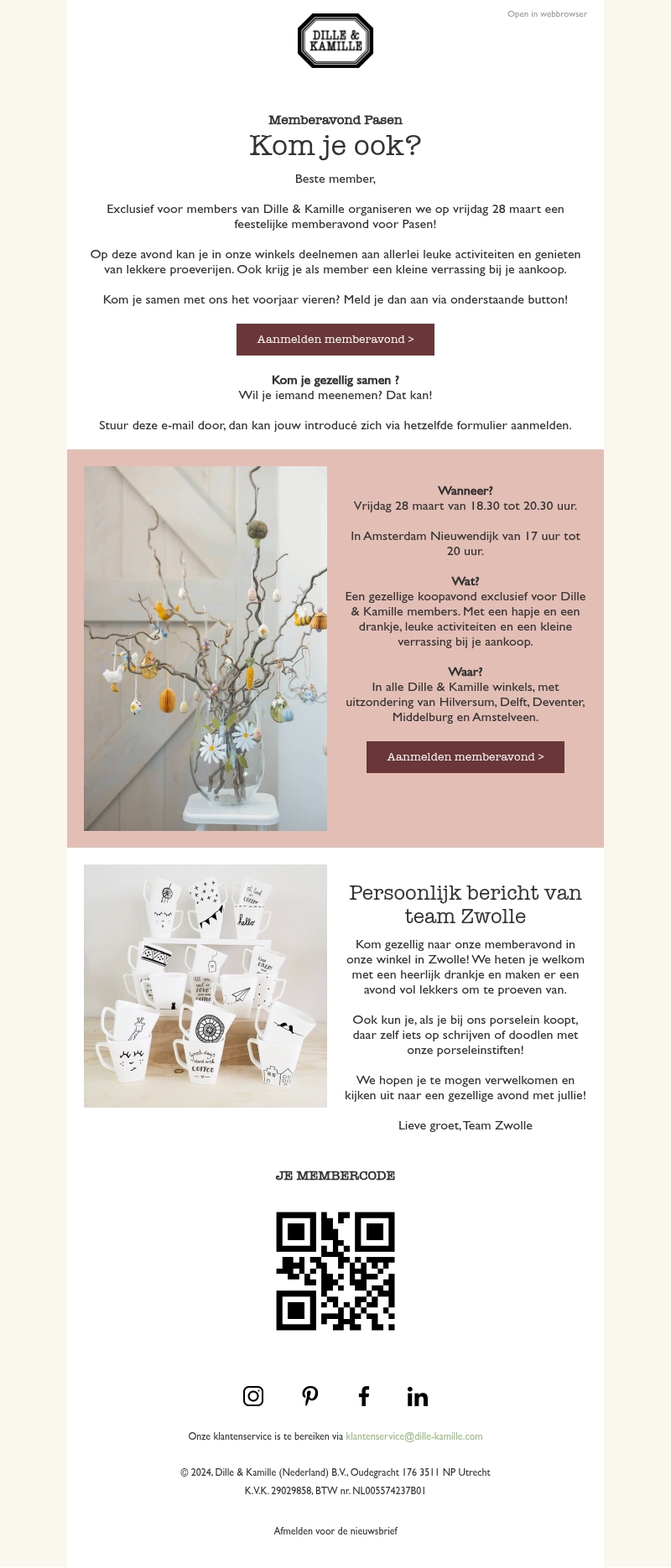 Beleef een feestelijke avond speciaal voor leden van Dille & Kamille. Op vrijdag 28 maart ben je welkom om te genieten van leuke activiteiten, hapjes, en drankjes om het voorjaar te vieren. Neem gerust iemand mee en ontdek verrassingen bij aankoop. Meld je snel aan voor deze unieke ervaring.