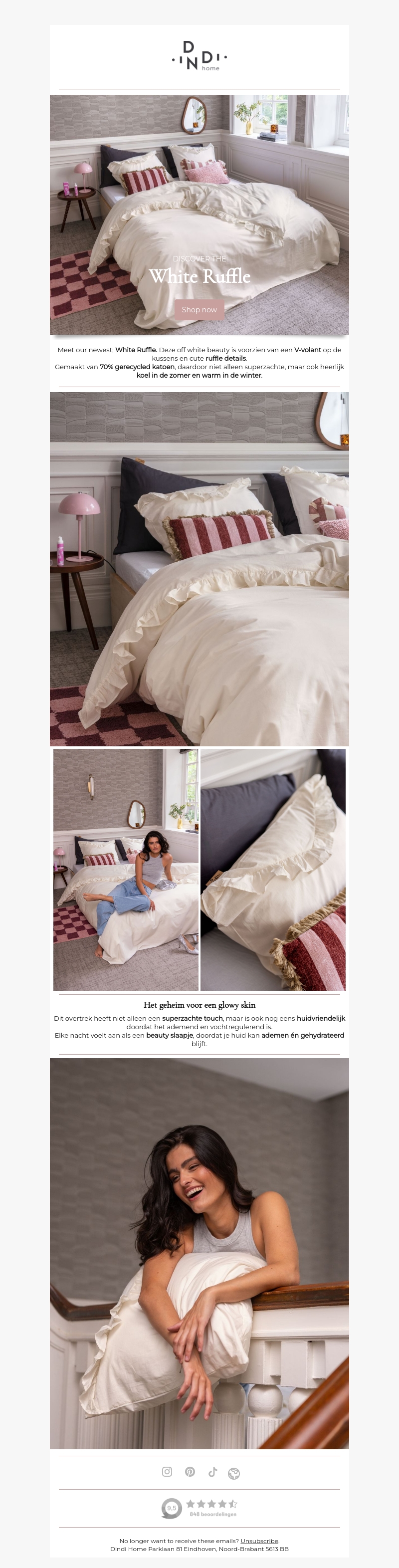 Maak kennis met onze nieuwste aanwinst, de White Ruffle bedsprei. Deze off white schoonheid is gemaakt van 70% gerecycled katoen, met een superzachte finish en cute ruffle details. Perfect om je slaapkamer op te fleuren en een comfortabele nachtrust te garanderen.