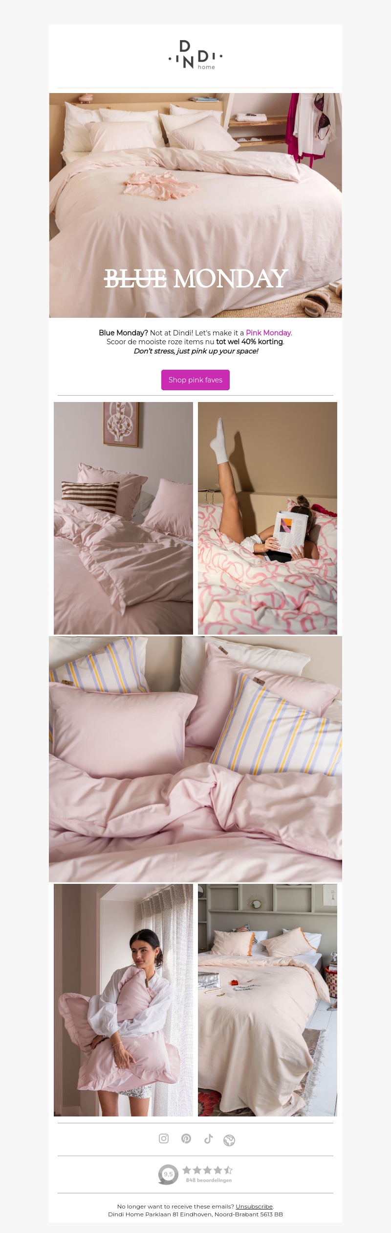 Maak van Blue Monday een Pink Monday met Dindi! Scoor nu de mooiste roze items en geniet van een aantrekkelijke korting van 40%. Laat je inspireren door onze zachte en stijlvolle beddengoedcollectie. Perfect om warmte en sfeer aan je slaapkamer toe te voegen. Ontdek de collectie en shop nu je favorieten.