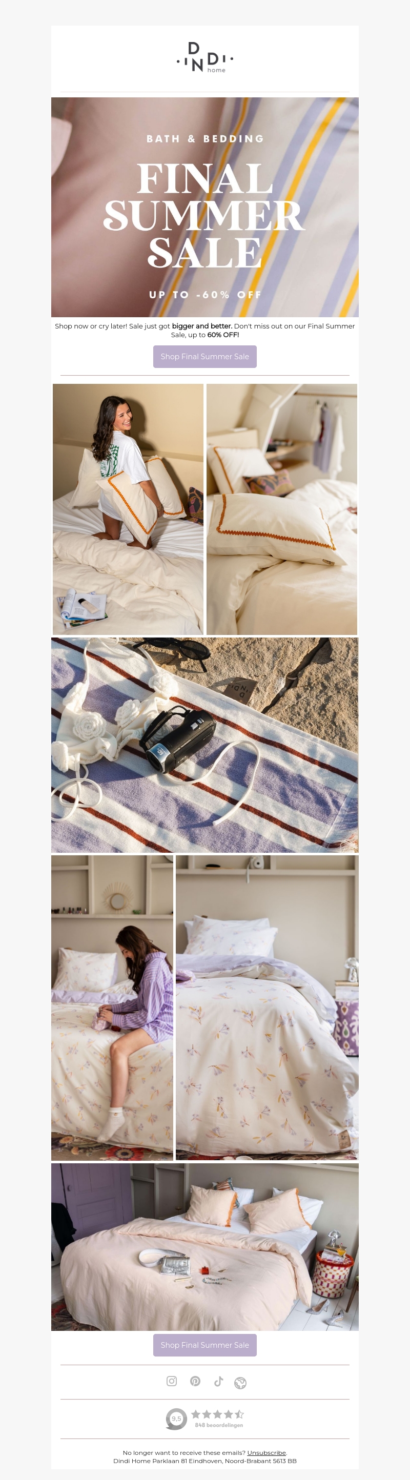 Laat deze kans niet voorbijgaan! Onze eind zomeruitverkoop is nu groter en beter met tot wel 60% korting op luxe bad- en beddengoed. Ontdek geweldige deals en verwen jezelf met nieuwe zachte handdoeken of comfortabel beddengoed. Perfect voor een frisse start van het nieuwe seizoen.