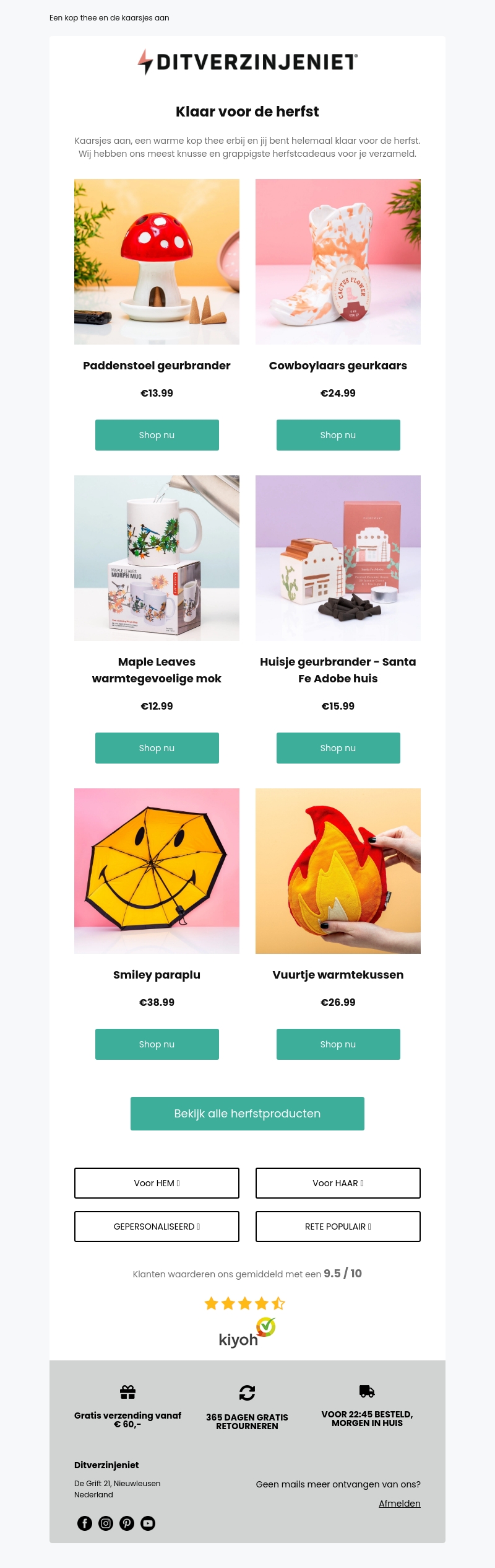 Kaarsjes aan, een warme kop thee erbij en jij bent helemaal klaar voor de herfst. Wij hebben ons meest knusse en grappigste herfstcadeaus voor je verzameld. Denk aan geurbranders, warmtekussens, mokken en nog veel meer.