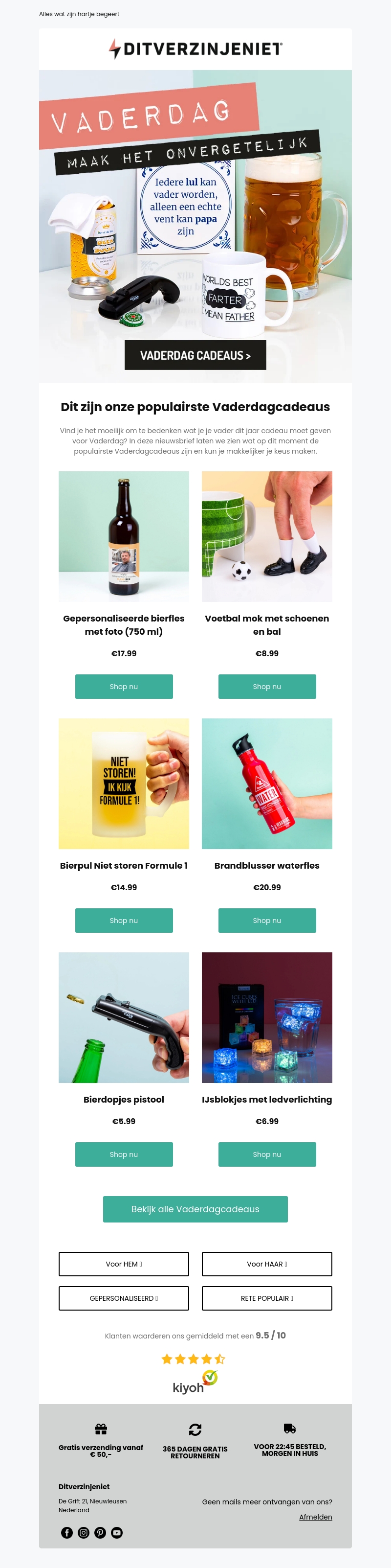 Vaderdag komt eraan en we hebben de beste cadeaus voor je papa verzameld! Van gepersonaliseerde bierflessen tot grappige mokken, er is voor ieder wat wils. Maak deze Vaderdag extra speciaal met onze unieke cadeau-opties. Ontdek onze populairste keuzes en shop nu!