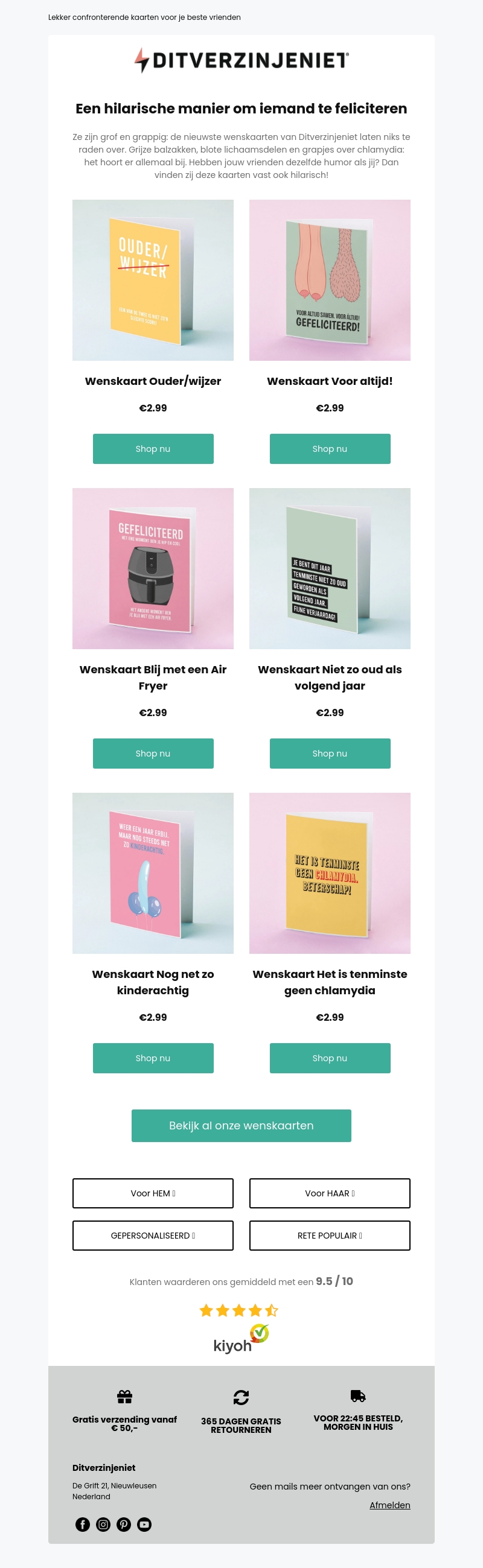 De nieuwste wenskaarten van Ditverzinjeniet zijn grof en grappig. Of je nu een verjaardagskaart nodig hebt of een felicitatiekaart, deze kaarten met humor passen perfect. Shop nu voor deze hilarische wenskaarten!