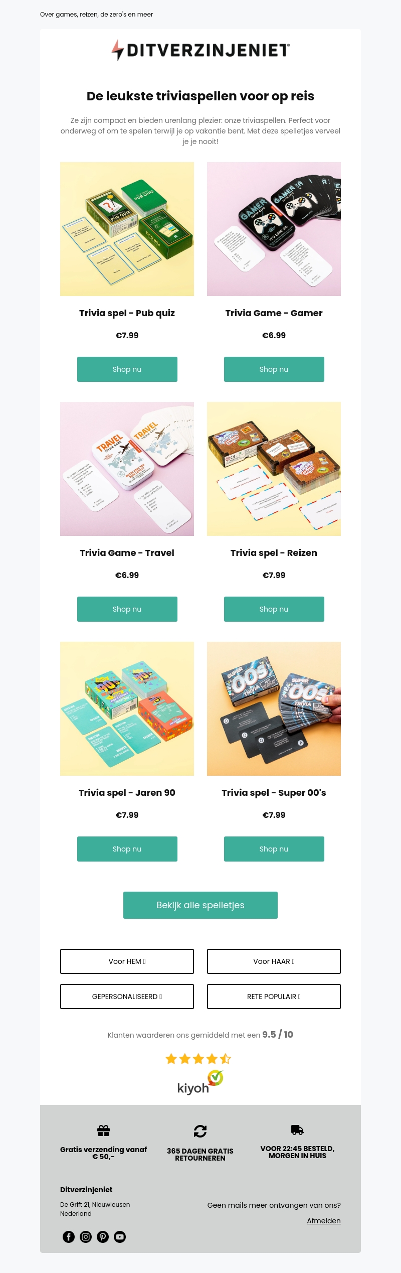 De zomervakantie staat voor de deur en wat is er leuker dan trivia spellen voor onderweg? Ontdek onze compacte en plezierige trivia spellen, ideaal voor op vakantie. We hebben verschillende thema's, van pubquiz en gamen tot reizen en de jaren 90. Voor iedereen is er wel iets leuks te vinden!