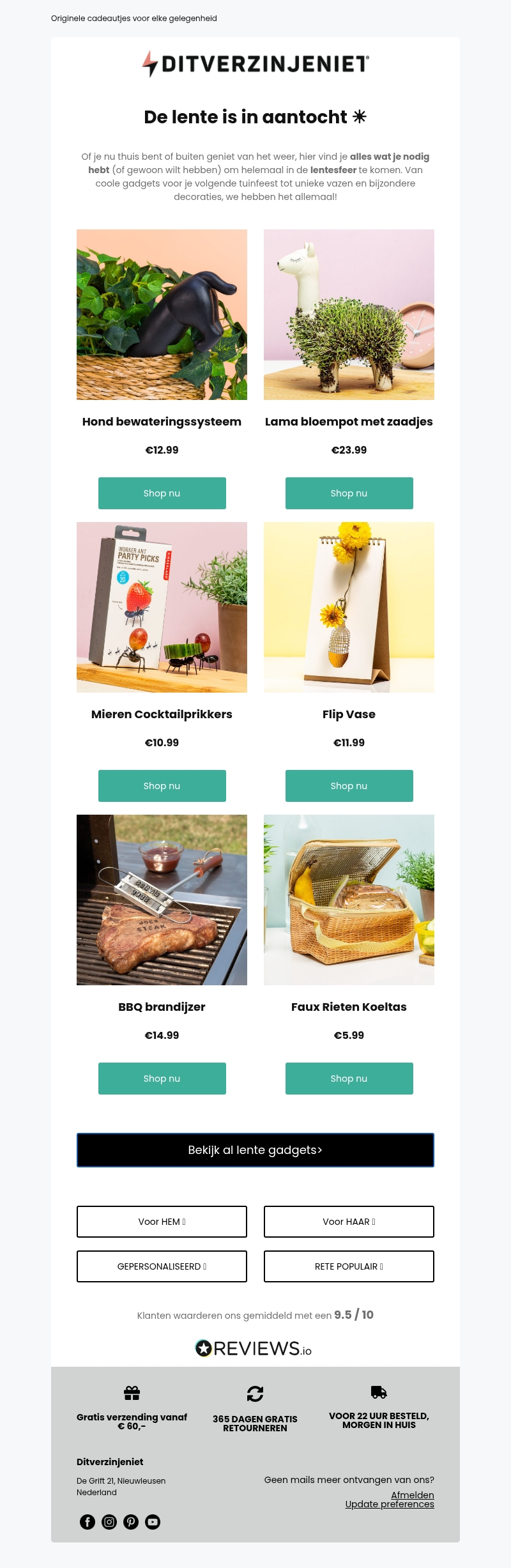 De lente komt eraan en bij Ditverzinjeniet vind je alles wat je nodig hebt om het voorjaar te vieren. Ontdek gadgets zoals het hond bewateringssysteem en de lama bloempot. Ideaal voor binnen en buiten decoraties. Maak je barbecue compleet met de BBQ brandijzer of koel je drankjes in stijl met de faux rieten koeltas. Laat de lente maar komen!