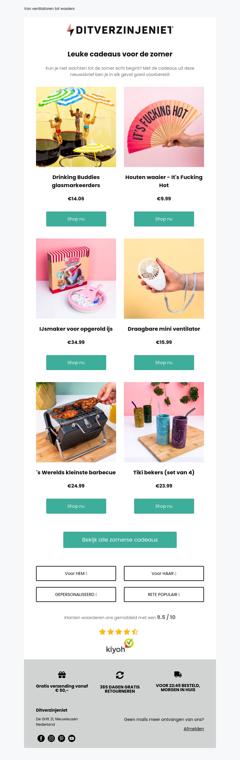 Ben je klaar voor de zomer? Wij wel! Ontdek in deze nieuwsbrief onze top zomerproducten, waaronder de Drinking Buddies glasonderzetters, een houten waaier, een draagbare mini-ventilator, en meer. Shop nu en maak je zomer nog leuker!