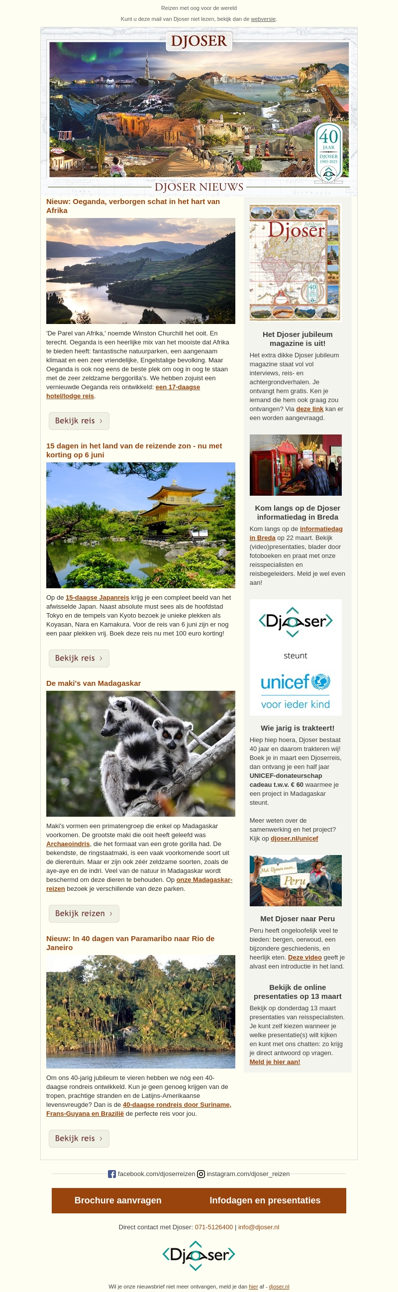 In deze nieuwsbrief van Djoser ontdek je de verborgen schatten van Afrika, ervaar je de rijkdom van Japanse cultuur en ga je op een adembenemende reis door Zuid-Amerika. Geniet van speciale kortingen en ontdek unieke reisroutes in Oeganda, Japan en de Latijns-Amerikaanse landen. Leer meer over de natuur en culturen terwijl je wereldse avonturen beleeft.