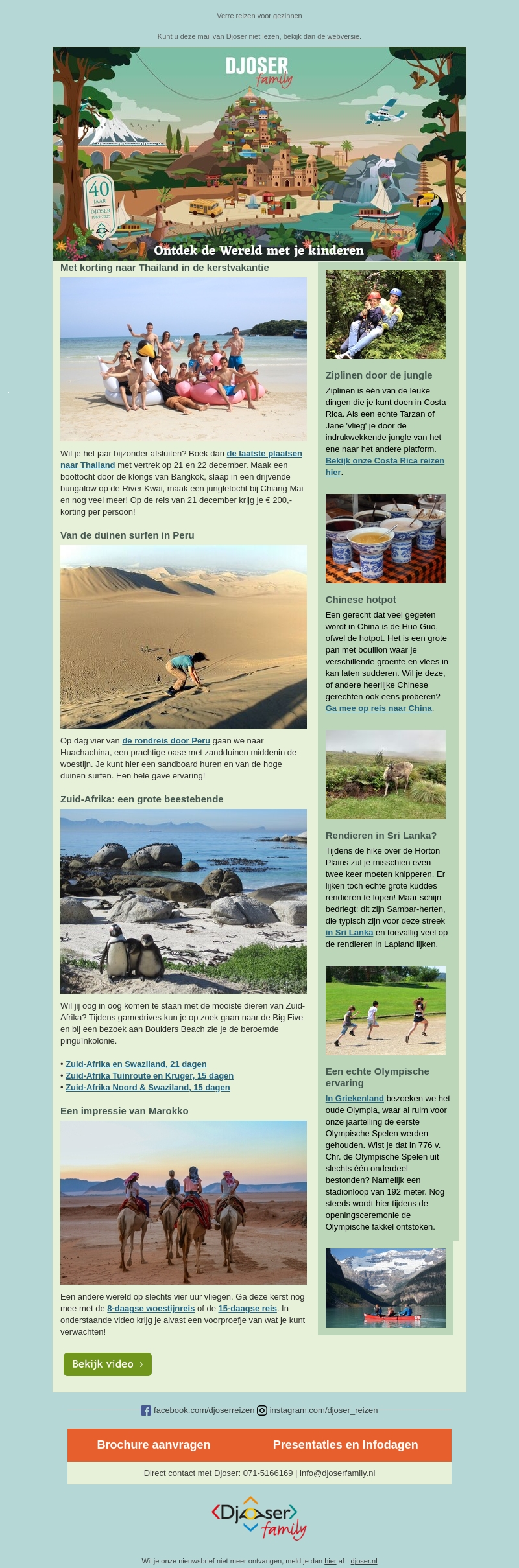 Ga op avontuur met Djoser! Bezoek Thailand tijdens de kerstvakantie met exclusieve kortingen. Surf op de duinen van Peru of ontmoet de Big Five in Zuid-Afrika. Ervaar ziplinen in Costa Rica en proef traditionele Chinese hotpot. Perfect voor gezinnen die de wereld willen ontdekken.