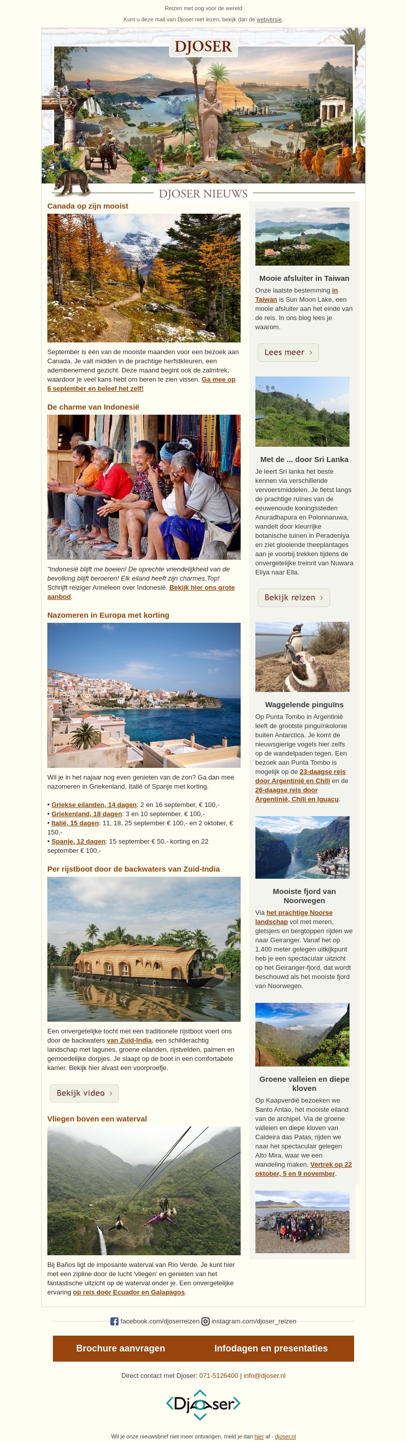 September is ideaal voor een bezoek aan Canada met zijn schitterende landschappen. Profiteer van nazomerkortingen in Europa, inclusief Griekenland, Italië en Spanje. Ontspan tijdens een onvergetelijke rijstboottocht door de backwaters van Zuid-India. Onze nieuwsbrief biedt reisaanbiedingen en tips voor uw volgende avontuur.
