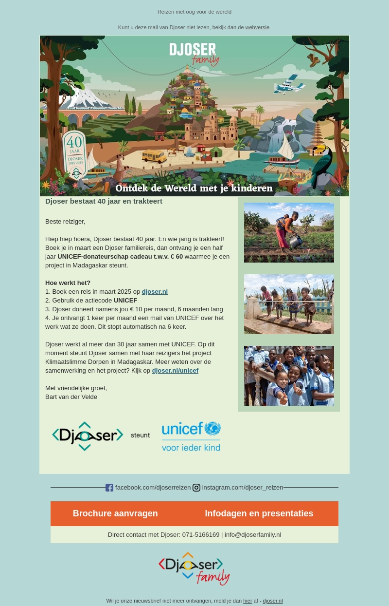 Djoser bestaat 40 jaar en viert dit met speciale aanbiedingen. Boek een familierijs in maart en ontvang een half jaar UNICEF-donateurschap cadeau ter waarde van €60. Djoser doneert namens elke reiziger aan UNICEF. Steun projecten zoals Klimaatslimme Dorpen in Madagaskar.
