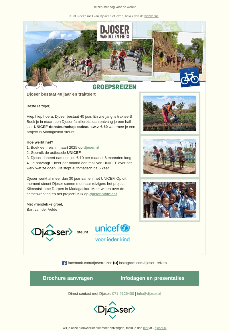 Djoser viert zijn 40-jarig jubileum en trakteert! Bij een familieboeking in maart ontvang je een UNICEF-donateurschap cadeau ter waarde van €60, waarmee je projecten in Madagaskar steunt. Boek je reis voor 2025, gebruik de code UNICEF, en draag bij aan een goed doel. Djoser en UNICEF werken al meer dan 30 jaar samen aan betekenisvolle projecten.