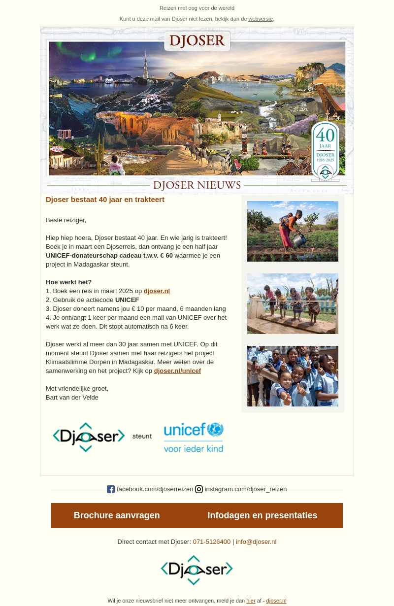 Djoser bestaat 40 jaar en viert dit met een speciaal aanbod! Boek een reis in maart 2025 en ontvang een half jaar donateurschap aan UNICEF ter waarde van €60. Djoser doneert namens jou aan een project in Madagascar. Ontvang maandelijks updates van UNICEF over hun werkzaamheden.