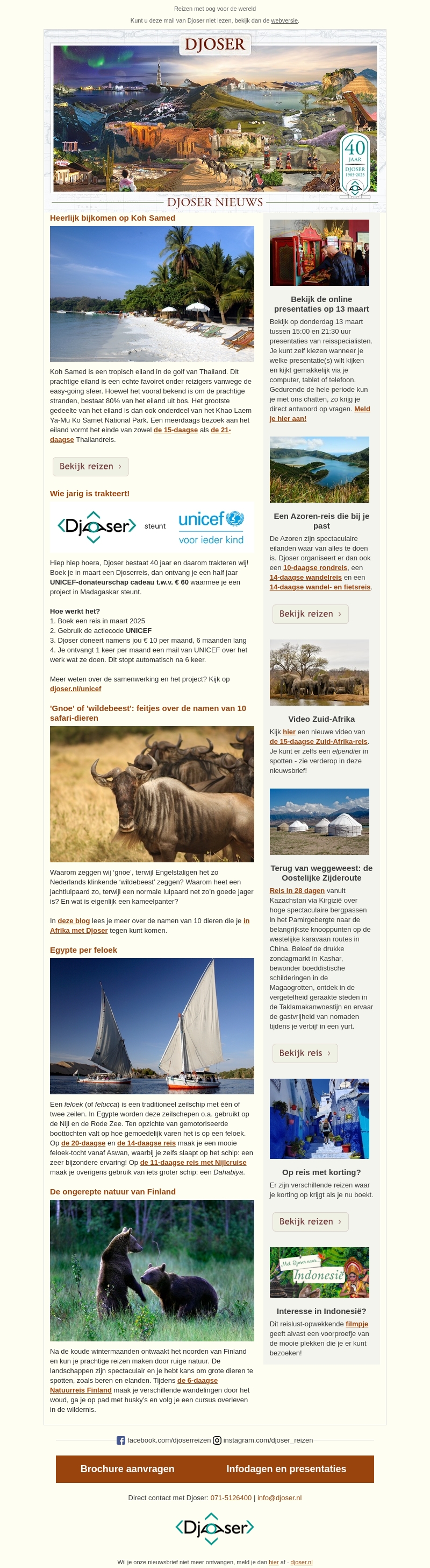 Beleef een tropisch paradijs op Koh Samed of vaar mee met een authentieke felucca in Egypte. Laat je betoveren door de natuur van Finland en ontmoet wilde dieren. Boek nu bij Djoser en steun UNICEF met een donatie voor een project in Madagaskar.