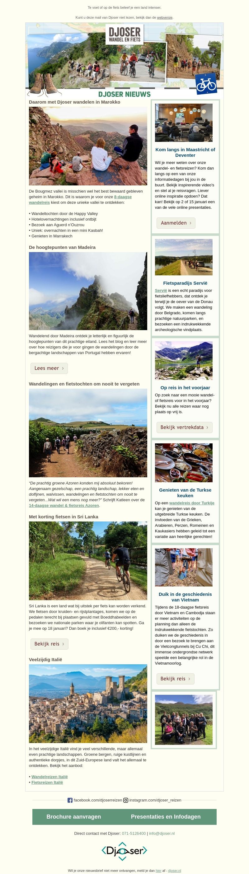 Deze nieuwsbrief van Djoser neemt je mee op een reis naar drie betoverende bestemmingen: Madeira, Sri Lanka en Servië. Ontdek de hoogtepunten van Madeira tijdens een inspirerende wandeltocht. Ervaar de unieke schoonheid van Servië op de fiets. En geniet van de adembenemende natuur van Sri Lanka met een speciale korting van €200. Kies voor avontuur en ontdek de wereld met Djoser.