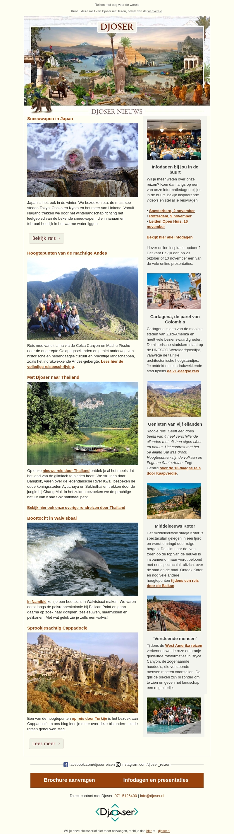 Beleef de magie van de Japanse sneeuwapen in de warme wateren van Nagano en verken het adembenemende landschap van Cappadocië in Turkije. Ons reisaanbod omvat ook een nieuwe reis door Thailand met een mix van cultuur en natuur. Ontdek meer over deze fantastische bestemmingen en plan je volgende avontuur met ons.