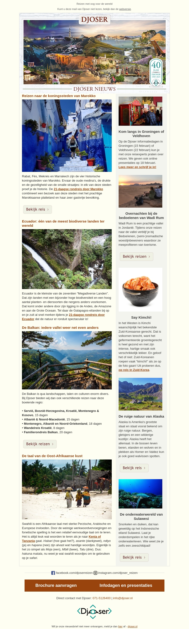 Deze nieuwsbrief biedt een kijkje in de koningssteden van Marokko, de biodiversiteit van Ecuador, en de valleien van de Balkan. Maak kennis met historische steden, adembenemende natuur en diverse culturen. Boek een reis en ervaar het avontuur met Djoser.