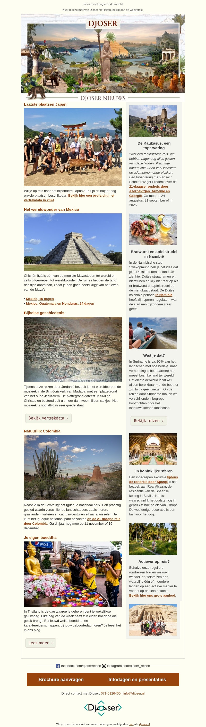 Grijp de laatste plaatsen voor een reis naar het bijzondere Japan. Bezoek het wereldwonder Chichén Itzá in Mexico en ontdek de fascinerende geschiedenis ervan. Verken het prachtige natuurpark Iguaque in Colombia. Geniet van Duitse invloeden in Namibië met bratwurst en apfelstrudel. Ontdek ook andere bestemmingen zoals Jordanië en Spanje.