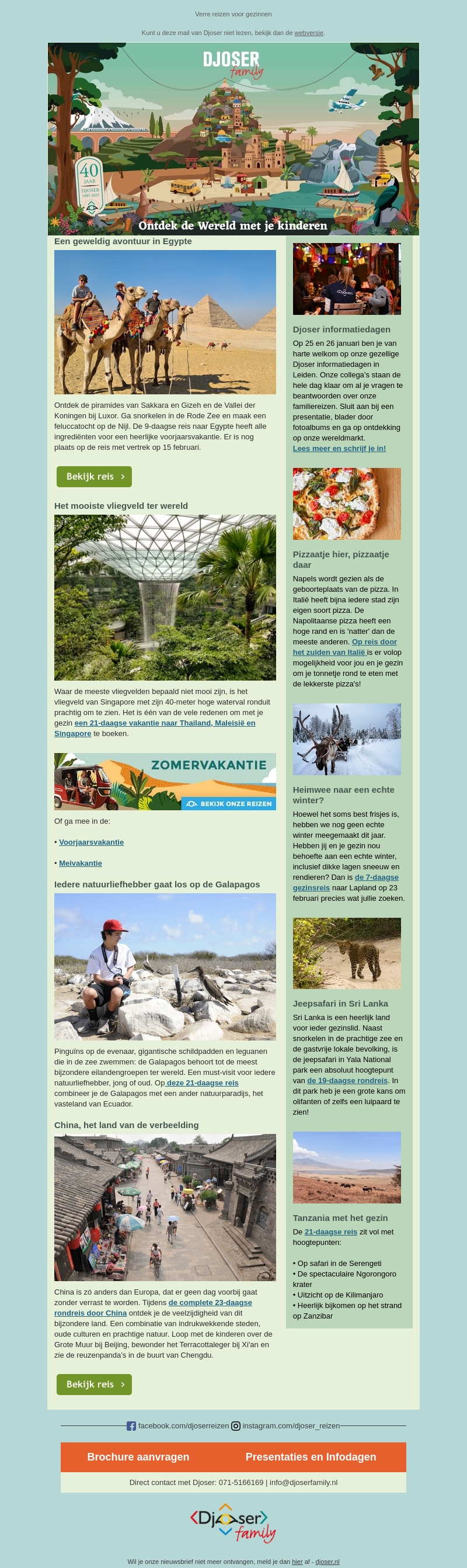 Beleef een geweldig avontuur in Egypte en ontdek de piramides, terwijl je geniet van snorkelen in de Rode Zee. Of kies voor een jeepsafari in Sri Lanka en verken het Yala National Park. Djoser Family biedt onvergetelijke gezinsreizen voor het hele gezin. Ontdek ook andere bestemmingen zoals de Galapagos, China en Tanzania.