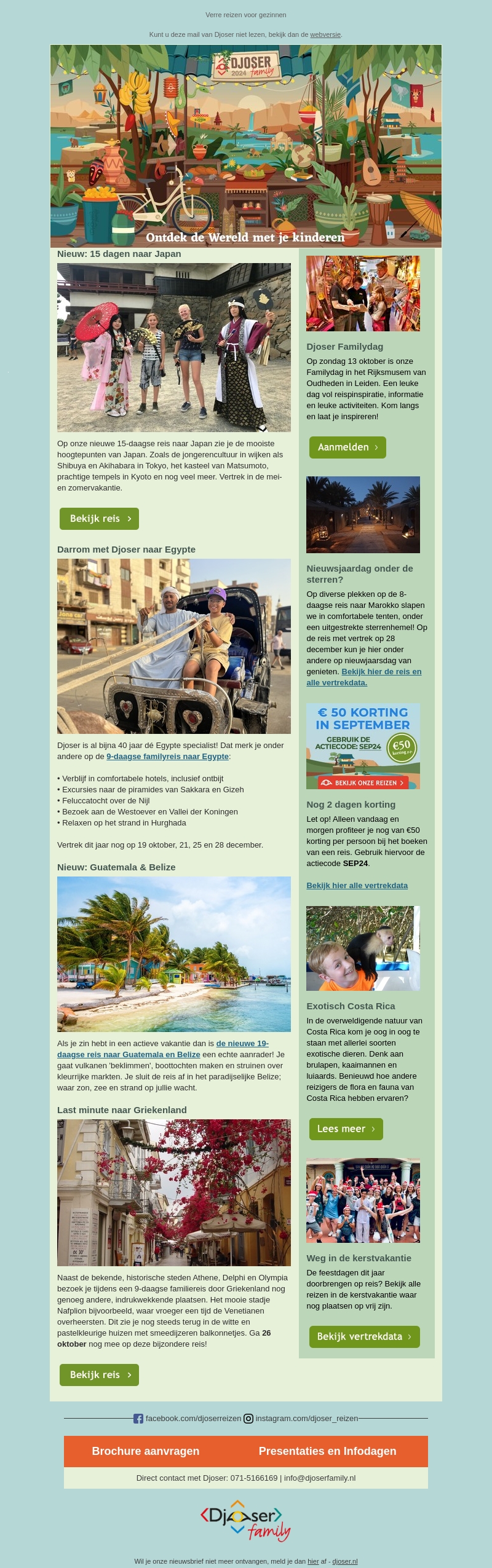 Ontdek de spannende nieuwe reizen van Djoser! Van een 15-daagse reis naar Japan tot een avontuurlijke reis naar Egypte en het exotische Costa Rica. Profiteer van speciale kortingen, herinner je aan de gezellige Djoser Familyday en bekijk de verschillende reisopties in onze nieuwsbrief.